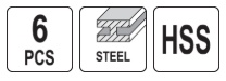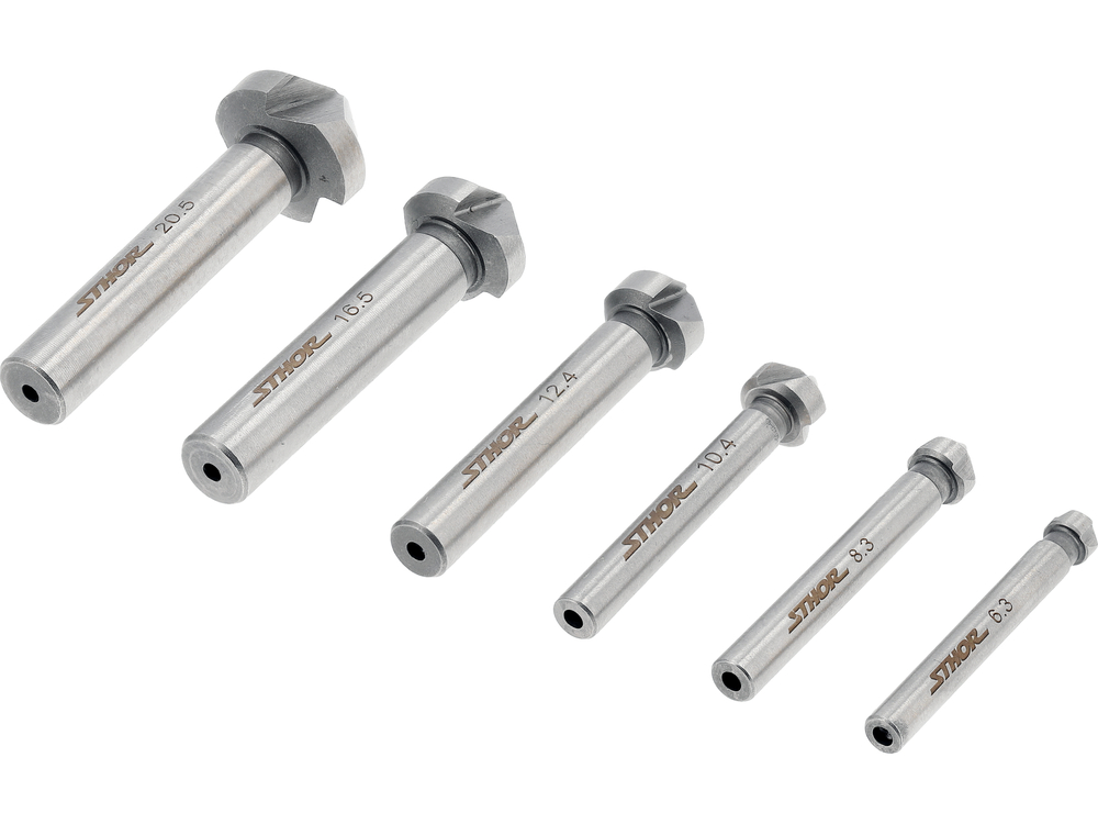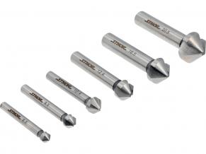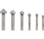 A set of 6 metal countersinks made of high-speed steel HSS, which makes them exceptionally strong, durable, and resistant to wear, enabling work at high speeds. They are perfect for enlarging, shaping, and chamfering hole edges, processing surfaces around the hole, or removing burrs.