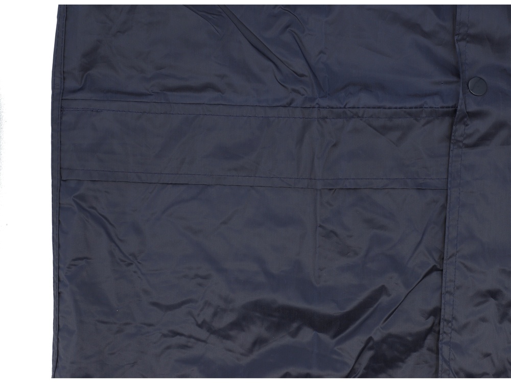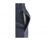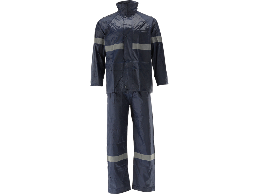 2-piece rain suit with reflective strips for improved visibility. Jacket with two large pockets and adjustable hood, pants with stretchy waistband and slits on the sides to access the pockets of the pants underneath.
