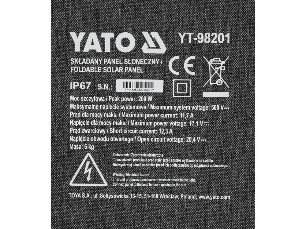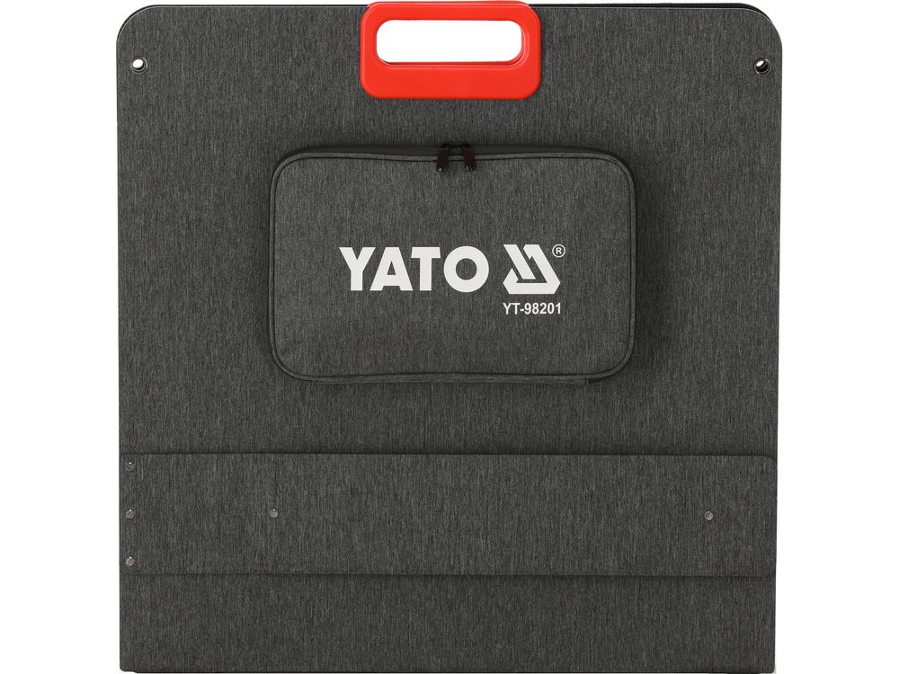 A foldable solar panel with an output power of 200 watts is a portable source of energy. The ETFE solar cell lamination guarantees resistance to weather conditions. Adjustment of the brackets allows you to position the panel conveniently in relation to the sunlight or hang it in a chosen location using mounting holes. When folded, the panel has compact dimensions, which combined with built-in handles make it easy to carry.