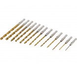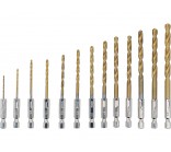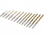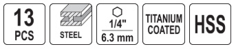 A set of 13 drills for metal made of high-speed steel HSS, which makes the drills exceptionally strong, durable, and resistant to wear, enabling work at high speeds. The surface coated with titanium nitride increases their hardness, resistance to wear, heat, and corrosion, and also reduces friction. They are perfect for high-performance machining.
