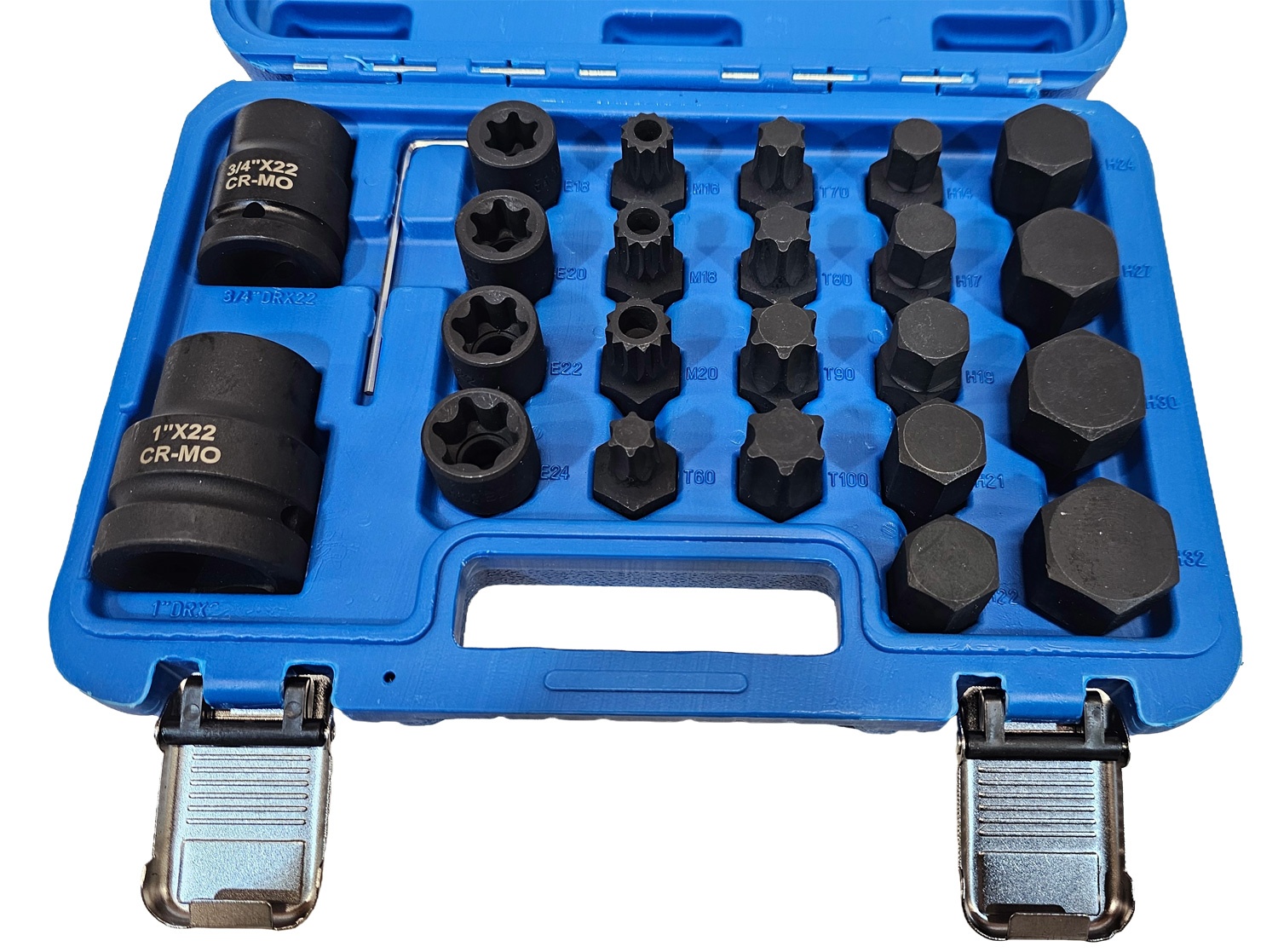 5 x Star* impact bits: T60, T70, T80, T90, T100 A dual 3/4"" and 1"" square drive impact socket and bit set that includes a comprehensive selection of hex, star* and spline profiles. Ideal for use on commercial vehicles. A high quality set designed for the demands of impact driving. Supplied in a robust box (180mm x 270mm) for secure and organised tool storage. An ideal kit for the safe and fast adjustment of a wide range of fixings.