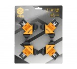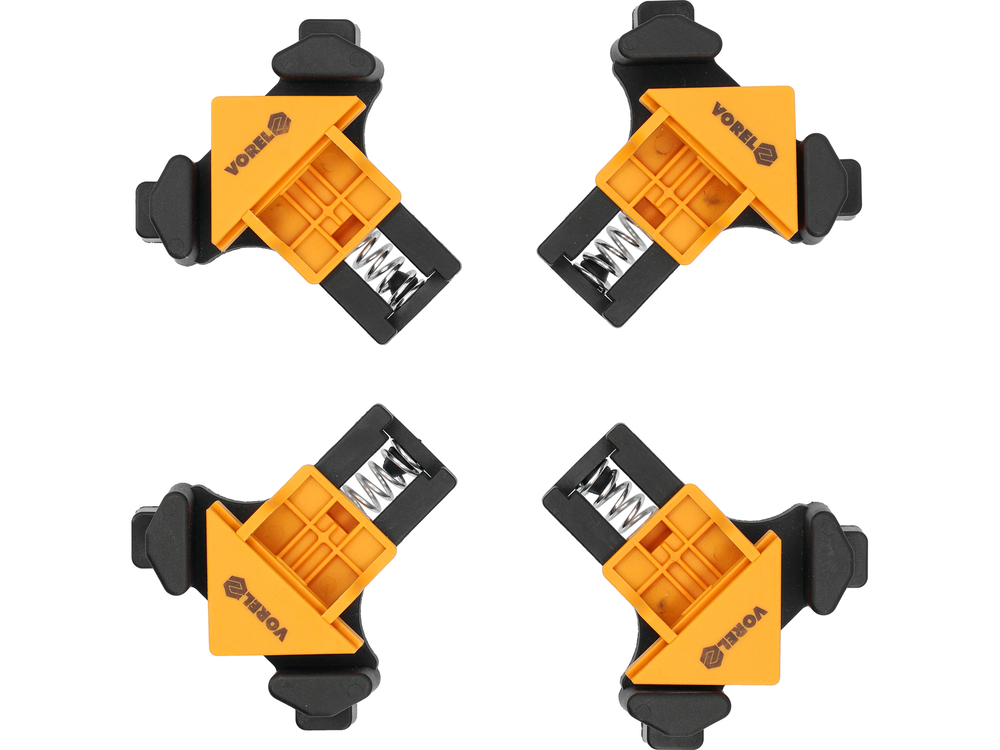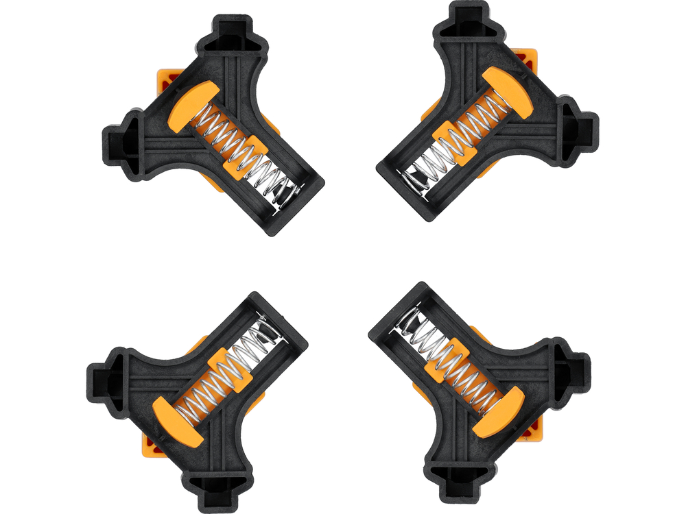 The set of spring corner clamps is a practical addition to any woodworking and assembly workshop, designed for quickly joining elements at a 90° angle. The spring-loaded design allows for efficient stabilization of components during gluing, screwing, or preliminary assembly, without the need for complex clamping systems. They are effective when working with wood, wood-based materials, and lightweight plastics, particularly for precisely aligning corners when assembling frames, boxes, furniture, and other constructions that require maintaining a right angle.