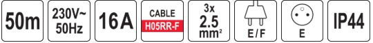 The cross-section of the single wires is as much as 2.5 mm², so the voltage drop along the entire length of the extension cord is minimal. This allows you to seamlessly power high-current demanding equipment such as inverter welders, compressors or large wood saws.
