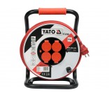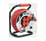Building and workshop extension cable reel YT-8108 with a length of 50 meters with 4 dust- and splash-proof sockets, thermal protection and child protection. The natural rubber sheathed cable wound on a drum made of durable plastic makes the extension cord suitable for indoor as well as outdoor use, such as construction sites, gardens, yards in front of factories.