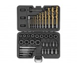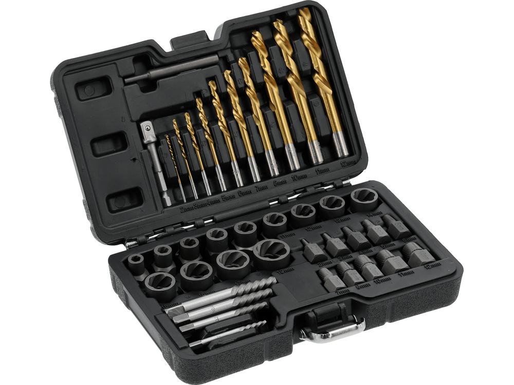 A professional set designed for effective removal of damaged, seized or broken screws, pins, and nuts. It is suitable for mechanical workshops, industrial workshops, and assembly work. It has been assembled to provide a wide range of sizes and working methods, allowing for the handling of steel and aluminum elements with damaged heads, worn sockets, and seized threaded connections. This practical solution is for professionals who expect reliability and versatility in one set.