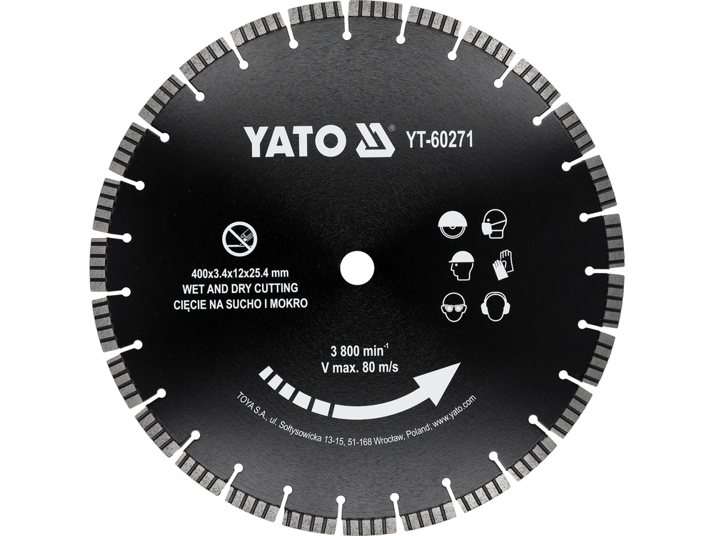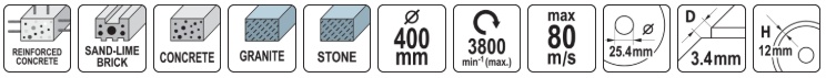 Diamond blade designed for dry and wet cutting of hardened and reinforced concrete, brick, granite, wall, stone, sandstone.