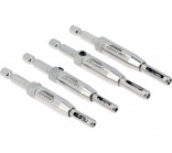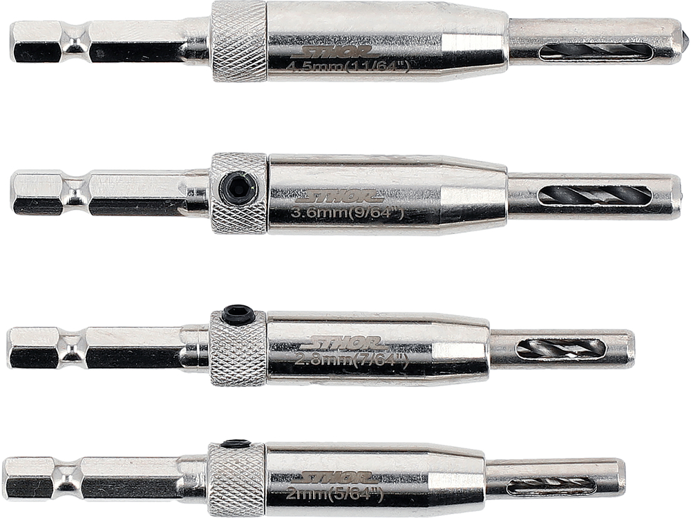Set of 4 self-centering drills designed for wood, plastics, and soft metals. Perfect for making mounting holes for guides and hinges in furniture. Special self-centering guide ensures that the drills are positioned precisely in the predetermined direction while drilling the holes.