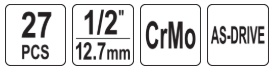1/2” impact sockets (short): 10, 12, 13, 14, 15, 16, 17, 18, 19, 21, 22, 24, 27, 30, 32 mm