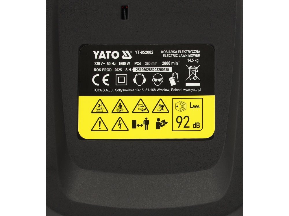 Электрическая газонокосилка | 1600 Вт | 360 мм | 45 л (YT-852082)