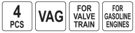 Specialized timing lock set designed for VAG group engines 1.2 and 1.4 TSI/TFSI, including units with cylinder deactivation system ACT/COD. It allows immobilization of the camshaft during inspection and adjustment of the valve timing.