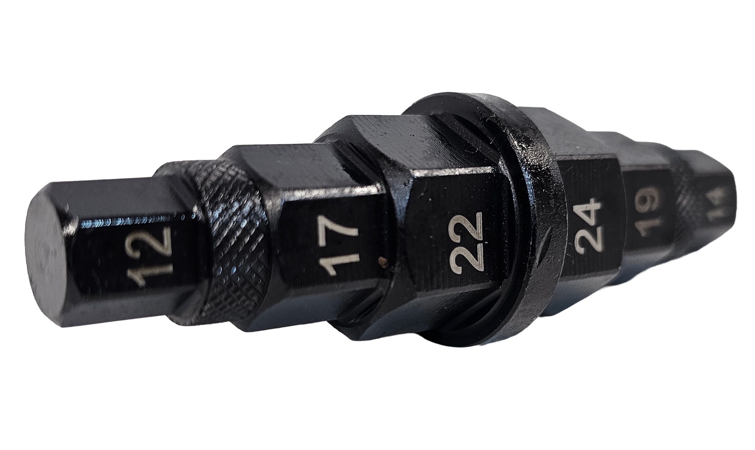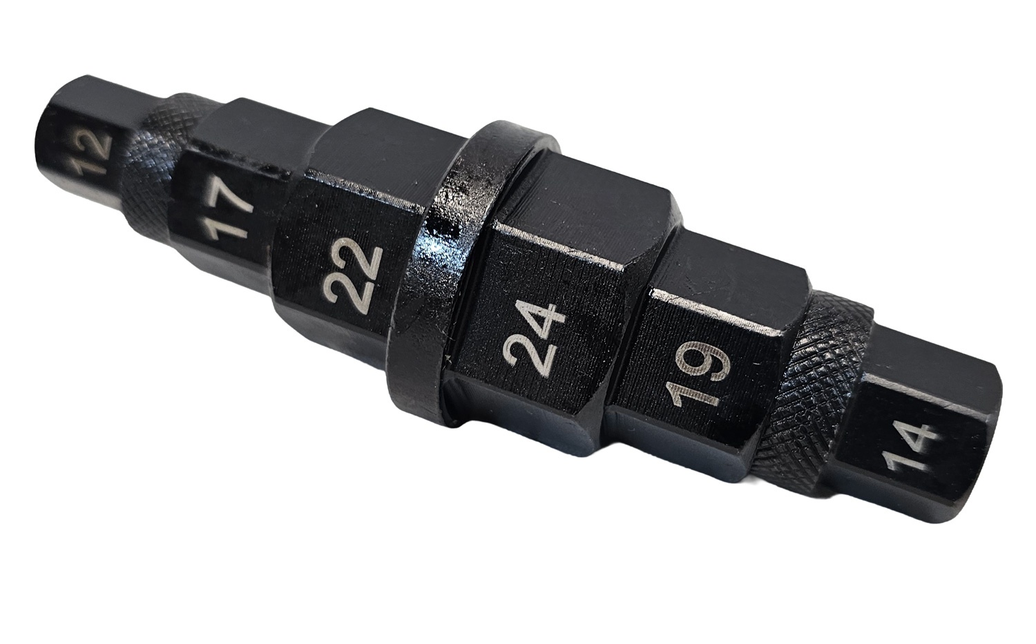 Length 110mm, Five Metric Hex Sizes 17mm, 19mm, 22mm, 24mm, 12mm and 14mm. The 19mm side can be used with a 3/8"" ratchet or open-end wrench, and the 17mm side can only be used with an open-end wrench