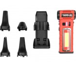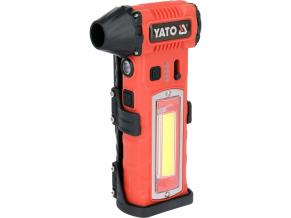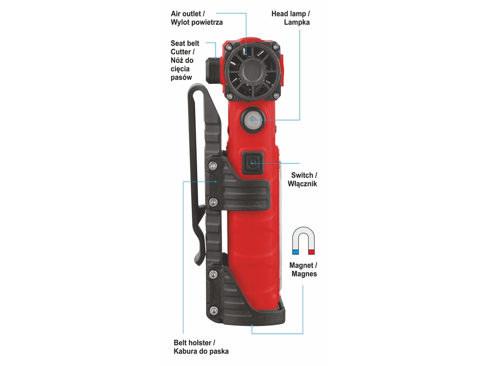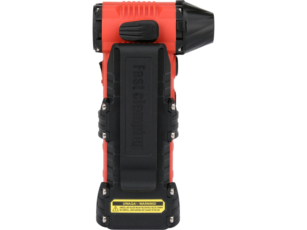 The device is equipped with two light sources: spot and area, with several lighting modes, which increases its functionality in conditions of limited visibility. Integrated into the side of the housing is a blade that allows for quick cutting of, among other things, plastic straps. Four magnets are placed on the bottom, allowing the blower to be easily attached to metal surfaces, which is particularly practical during service work, e.g. car repairs.