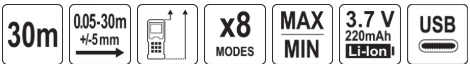 A pocket laser rangefinder is perfect for quick and precise distance measurements ranging from 0.05 to 30 meters and interior volume calculations. The compact dimensions of 86 mm x 23 mm x 12 mm, equivalent to the size of a man's index finger, make the tool extremely handy and pocket-sized. The laser is equipped with a calibration function, ensuring the accuracy of measurements even with frequent use.