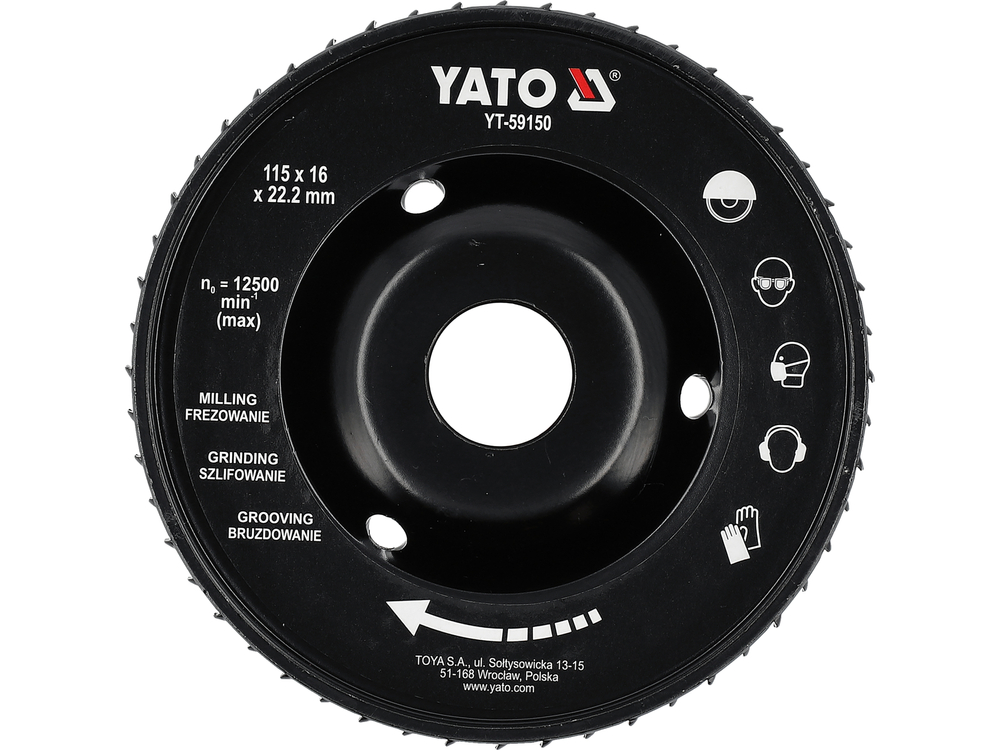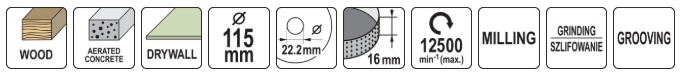 115 mm diameter milling cutter made of carbon steel designed for fast and effective processing of wood, aerated concrete, and plasterboard. The 16 mm thick blade ensures precise and stable cutting, while the hardened and lacquered surface increases the tool's durability.