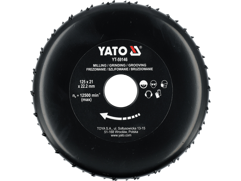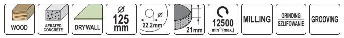 125 mm diameter milling cutter made of carbon steel designed for fast and effective processing of wood, aerated concrete, and plasterboard. The 21 mm thick blade ensures precise and stable cutting, while the hardened and lacquered surface increases the tool's durability.