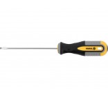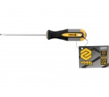 3x100 mm flat screwdriver from Vorel 60951. Made of CrV chrome-vanadium steel. The tip has a satin finish, additionally sandblasted and magnetized, which enables a secure grip of the screw head. The handle was made of two composite plastic. The hole in the handle allows you to hang the screwdriver.