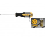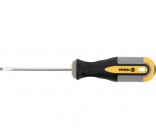 Slotted screwdriver 3x75 mm by Vorel 60950. Made of CrV chrome-vanadium steel. The tip has a satin finish, additionally sandblasted and magnetized, which enables a secure grip of the screw head. The handle was made of two composite plastic. The hole in the handle allows you to hang the screwdriver.