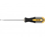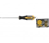 4x100 mm flat head screwdriver from Vorel 60952. Made of CrV chrome-vanadium steel. The tip has a satin finish, additionally sandblasted and magnetized, which enables a secure grip of the screw head. The handle was made of two composite plastic. The hole in the handle allows you to hang the screwdriver.