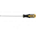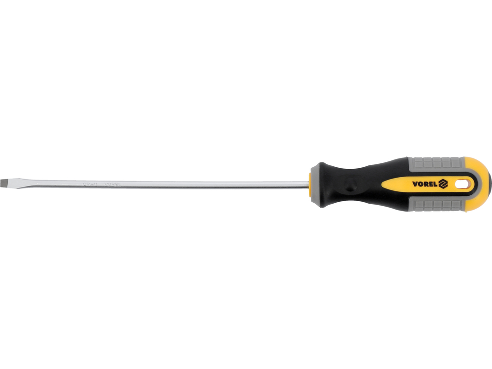 Vorel 60913 4x150 mm flat screwdriver. Made of CrV chromium-vanadium steel. The tip has a satin finish, additionally sanded and magnetized, which allows for secure gripping of the bolt head. The handle is made of two composite plastic. The hole in the handle allows you to mount the screwdriver.