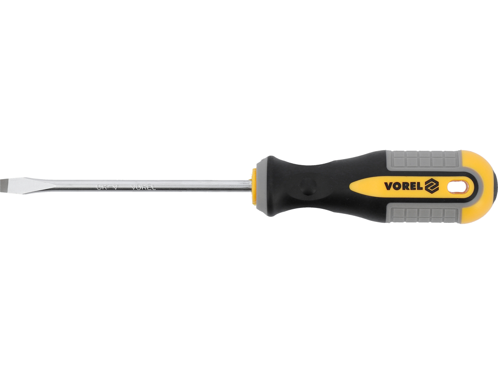 Slotted screwdriver 5x100 mm by Vorel 60954. Made of CrV chrome-vanadium steel. The tip has a satin finish, additionally sandblasted and magnetized, which enables a secure grip of the screw head. The handle was made of two composite plastic. The hole in the handle allows you to hang the screwdriver.