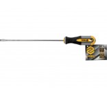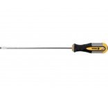 Vorel 60916 slotted screwdriver 5x200 mm. Made of CrV chrome vanadium steel. The tip has a satin finish, additionally sanded and magnetized, which allows a secure grip of the screw head. The handle is made of two composite plastic. The hole in the handle allows you to hang a screwdriver.