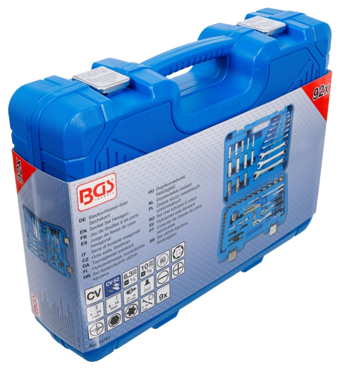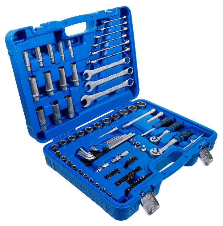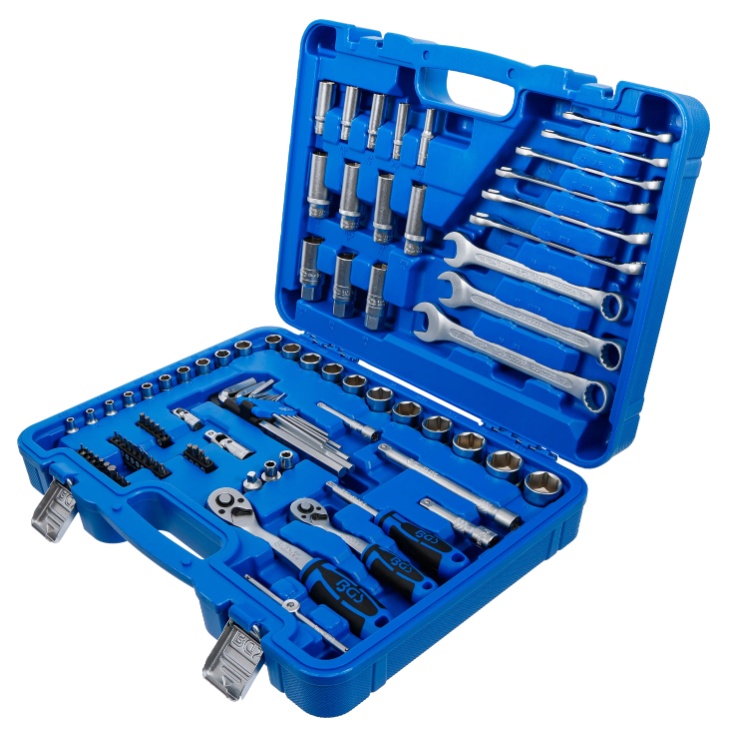 sockets, extension bars, reversible ratchets, spinner handle and combination wrenches made of chrome vanadium steel