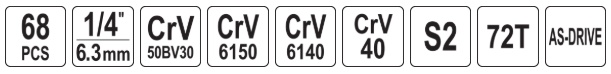 material: steel 40 CrV, CrV 6140, CrV 6150, CrV 50BV30 (sockets) and S2 (bits)