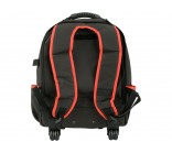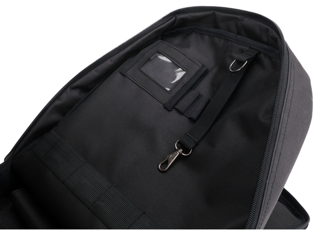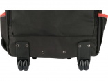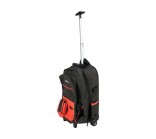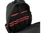 At the base, two wheels and a telescopic, retractable handle in the upper part were used, allowing for quick transformation of the backpack into a convenient transport suitcase. This solution relieves the spine when carrying a heavier set of tools. Wide, adjustable shoulder straps ensure comfort when carrying in a traditional way, evenly distributing the weight even when fully loaded.