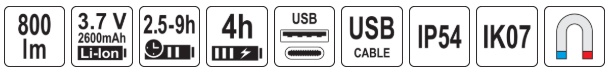 side panel 1 – diffused light: low mode 150 lm – up to 8 h, high mode 800 lm – up to 2.5 h
