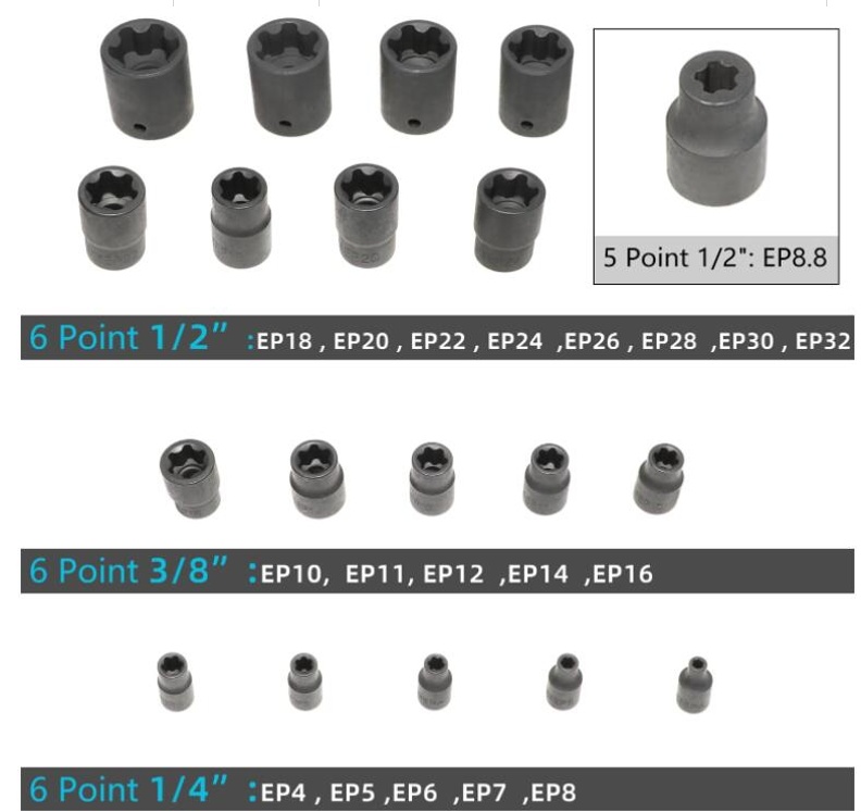 Heavy Duty EP Socket: The EP socket made of high quality hard steel, and you can use impact wrench or air tool