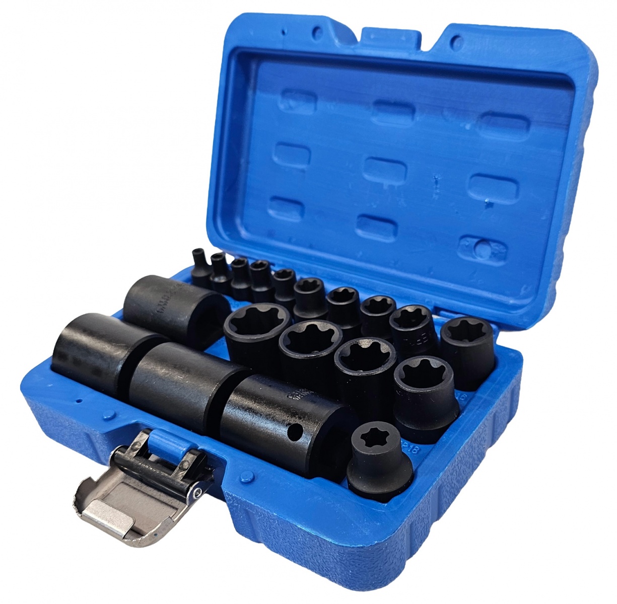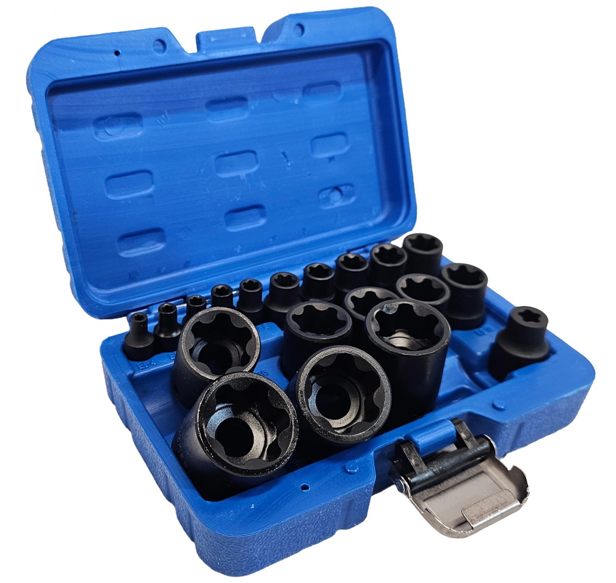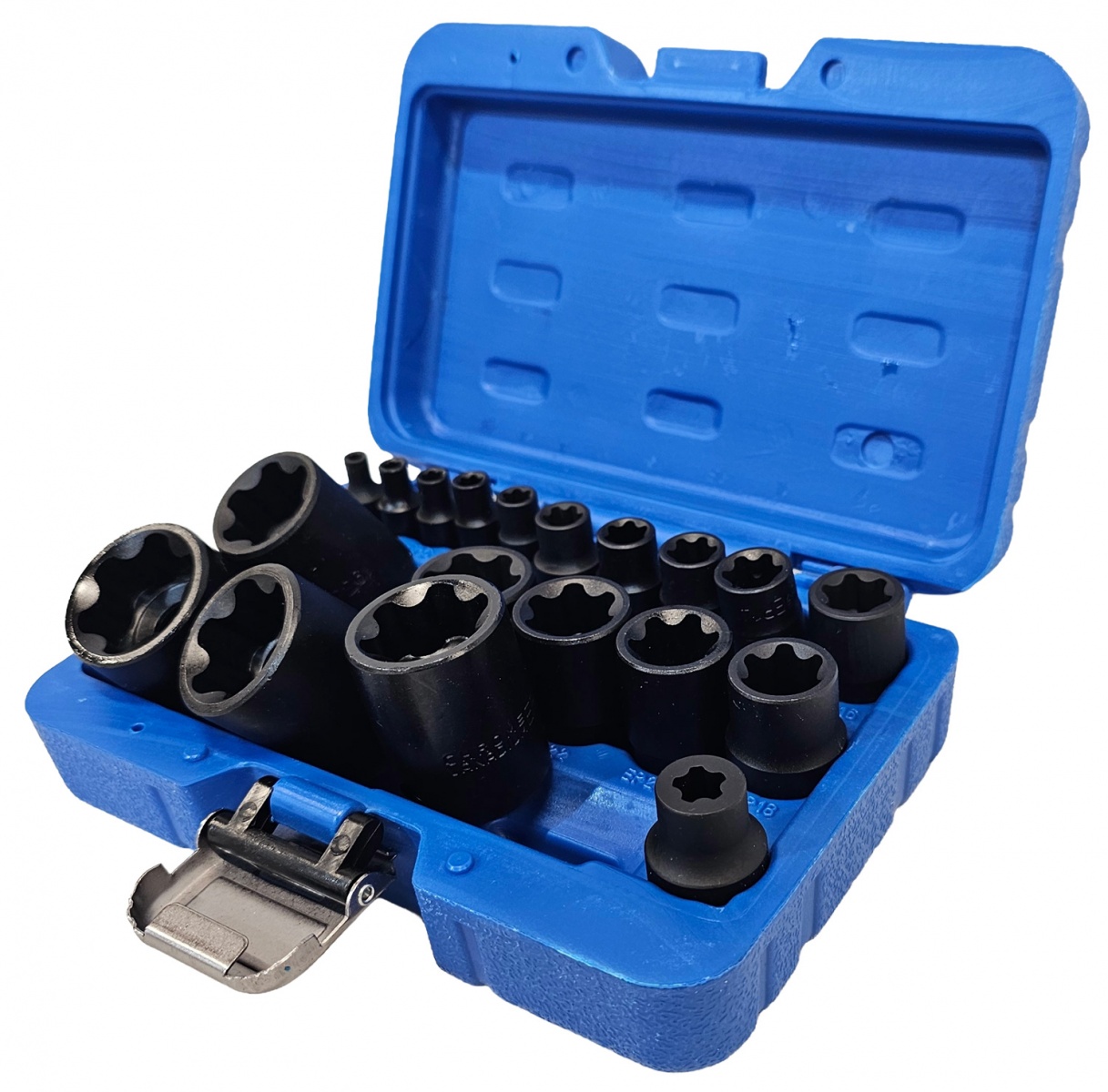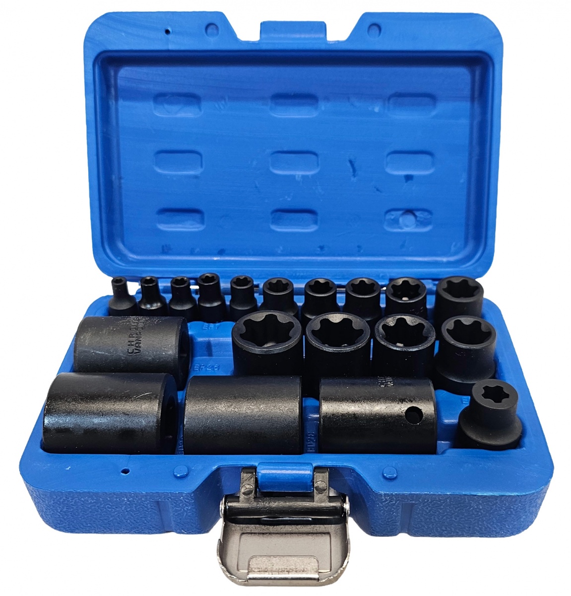 Specification: This kit includ 19pc different size external torx plus socket, 6 point EP4, EP5, EP6, EP7, EP8 with 1/4'' drive; 6 point EP10, EP11, EP12, EP14, EP16 with 3/8'' drive; 6 point EP18, EP20, EP22, EP24, EP26, EP28, EP30, EP32 with 1/2'' drive; 5 point EP8.8 with 1/2'' drive