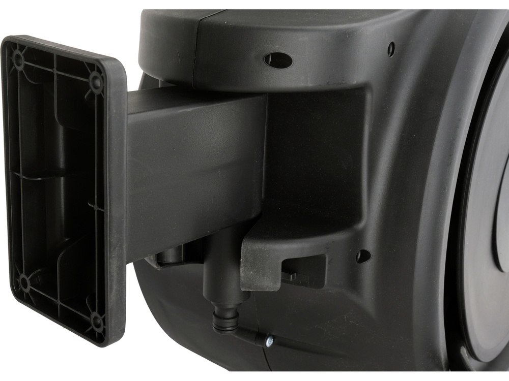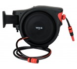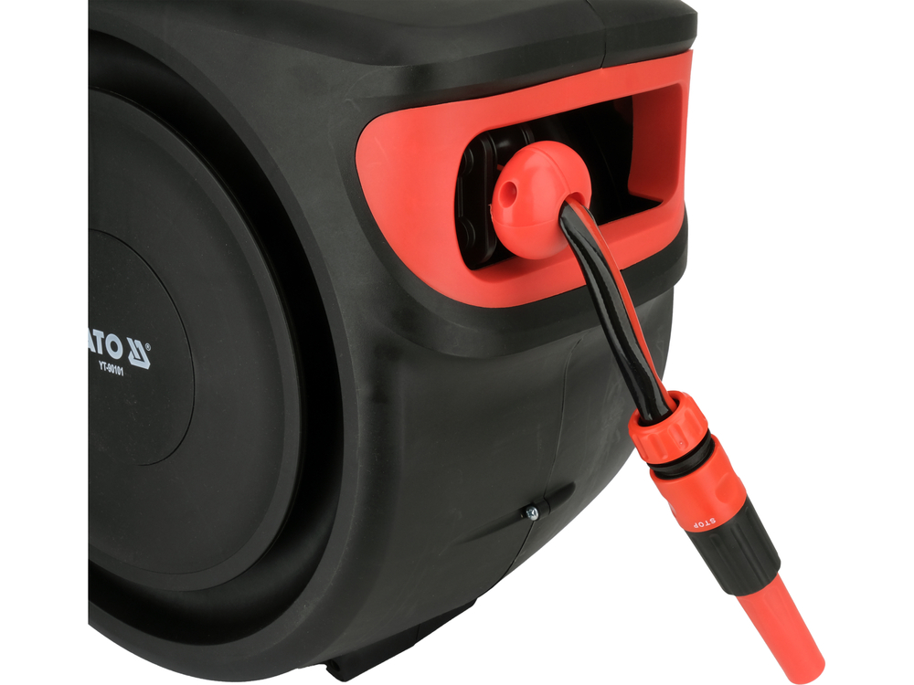 Garden hose with a length of 25 meters with an automatic reel mounted permanently on the wall. It facilitates organizing space, speeds up pulling out and retracting the hose after watering, and storing it without bends and tangles. Completely hiding it in the drum helps maintain order in the garden or by the house.