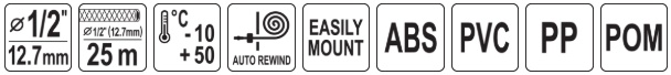garden hose 1/2" (12.7 mm), 25 m, 1/2" (12.7 mm) guide hose, 2.35 m, automatic retractor, fixing anchors x4, 1/2" (12.7 mm) quick-release coupling, 1/2" (12.7 mm) quick-release coupling stop,