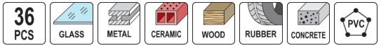 glass, metal, ceramics, wood, rubber, concrete, PVC